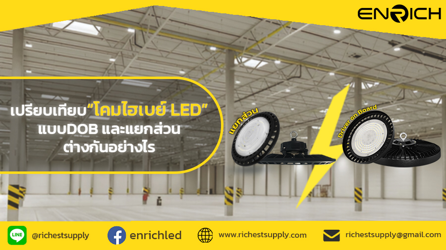 โคมไฮเบย์ เป็นโคมที่ถูกเลือกใช้สำหรับในพื้นที่ที่มีเพดานสูงไม่เกิน 14 เมตรเช่น โกดัง โรงงาน หรือสถานที่ที่ต้องการแสงสว่างสูง คุณอาจเคยได้ยินเกี่ยวกับโคมไฮเบย์แบบ DOB (Driver on Board) และ โคมไฮเบย์แบบแยกส่วน สองตัวเลือกนี้มีข้อดี-ข้อเสีย โคมไฮเบย์แบบDOB และแบบแยกส่วนความแตกต่างกันอย่างไร และแบบไหนเหมาะกับคุณมากที่สุด? วันนี้เราจะมาหาคำตอบกัน!