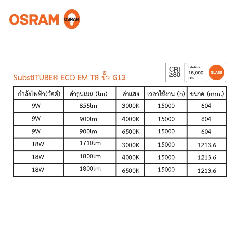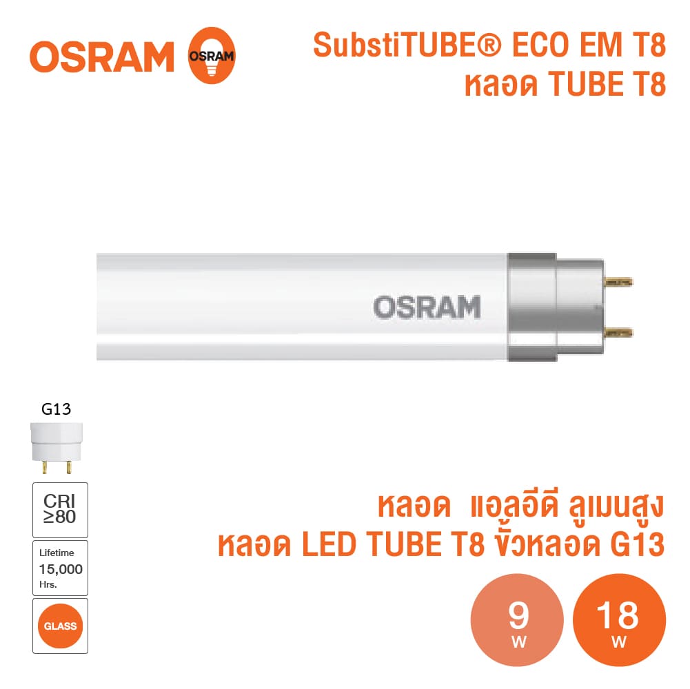หลอดไฟ LED OSRAM Tube 9W-18W T8 ขั้ว G13 Glass รุ่น ECO EM ขนาด 0.6 M.-1.2M.